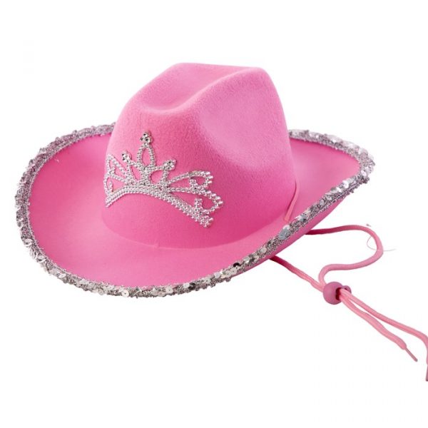 Sombrero Chica Cowboy de color rosa decorado con marabú y coronita para complementar tu disfraz, especialmente el de BARBIE .